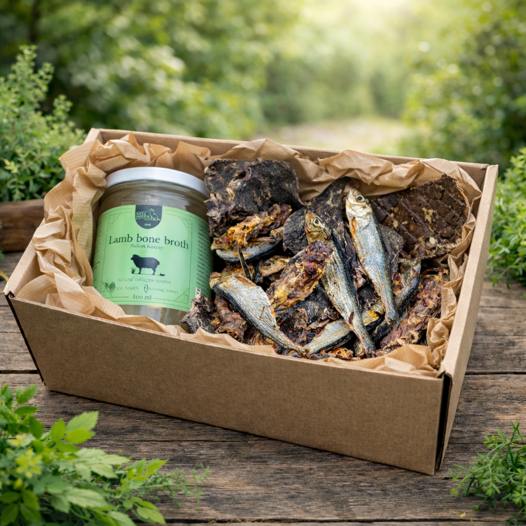 Комбинацията от костен бульон, рибки цаца и естествени животински протеини подпомага ставите, сухожилията и движението – особено важно за активни и по-възрастни кучета.